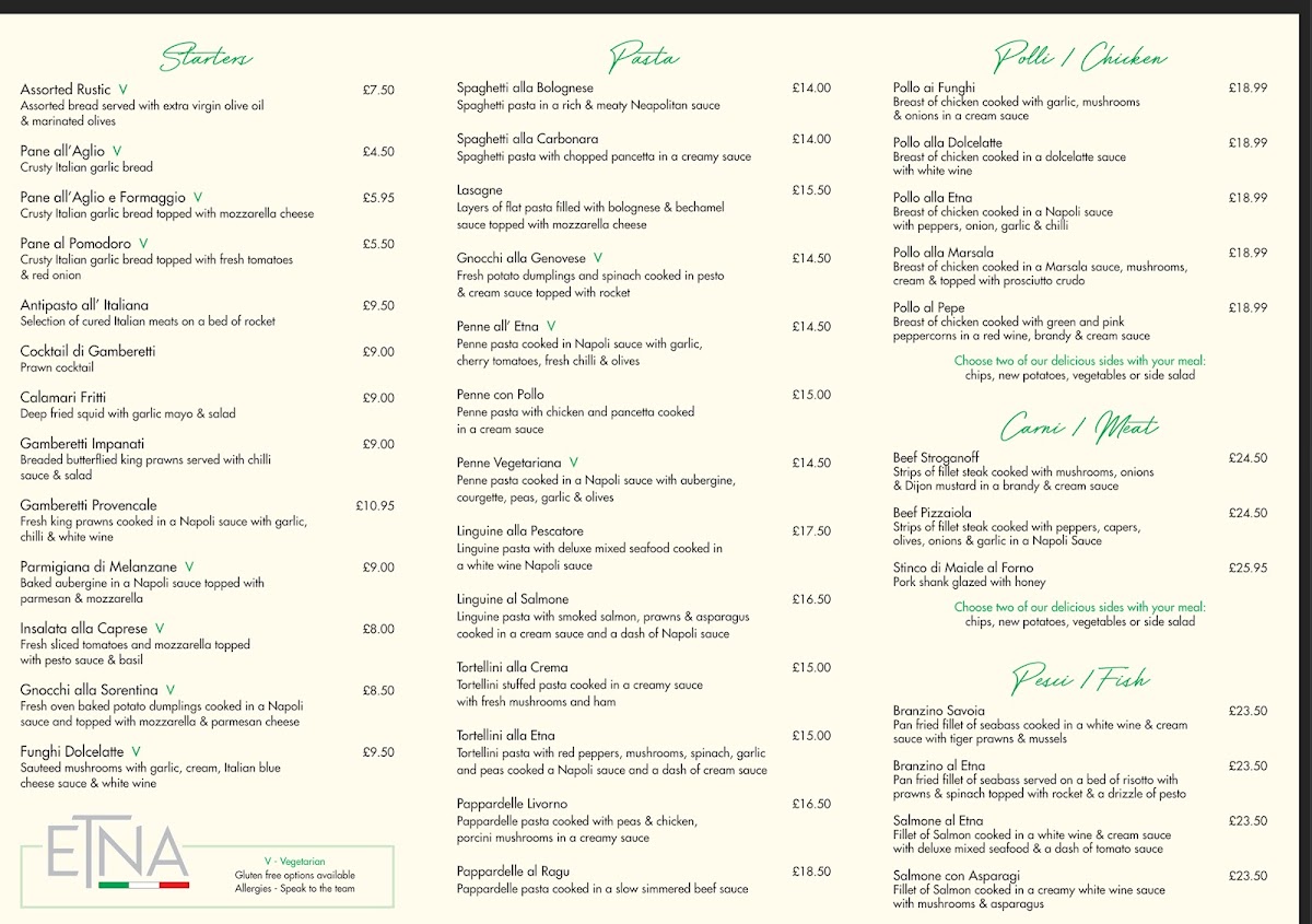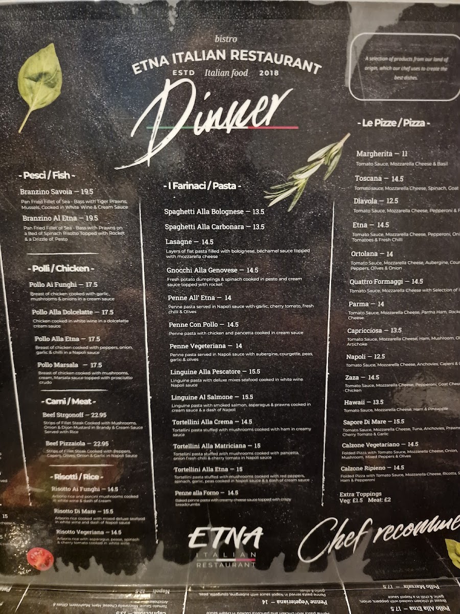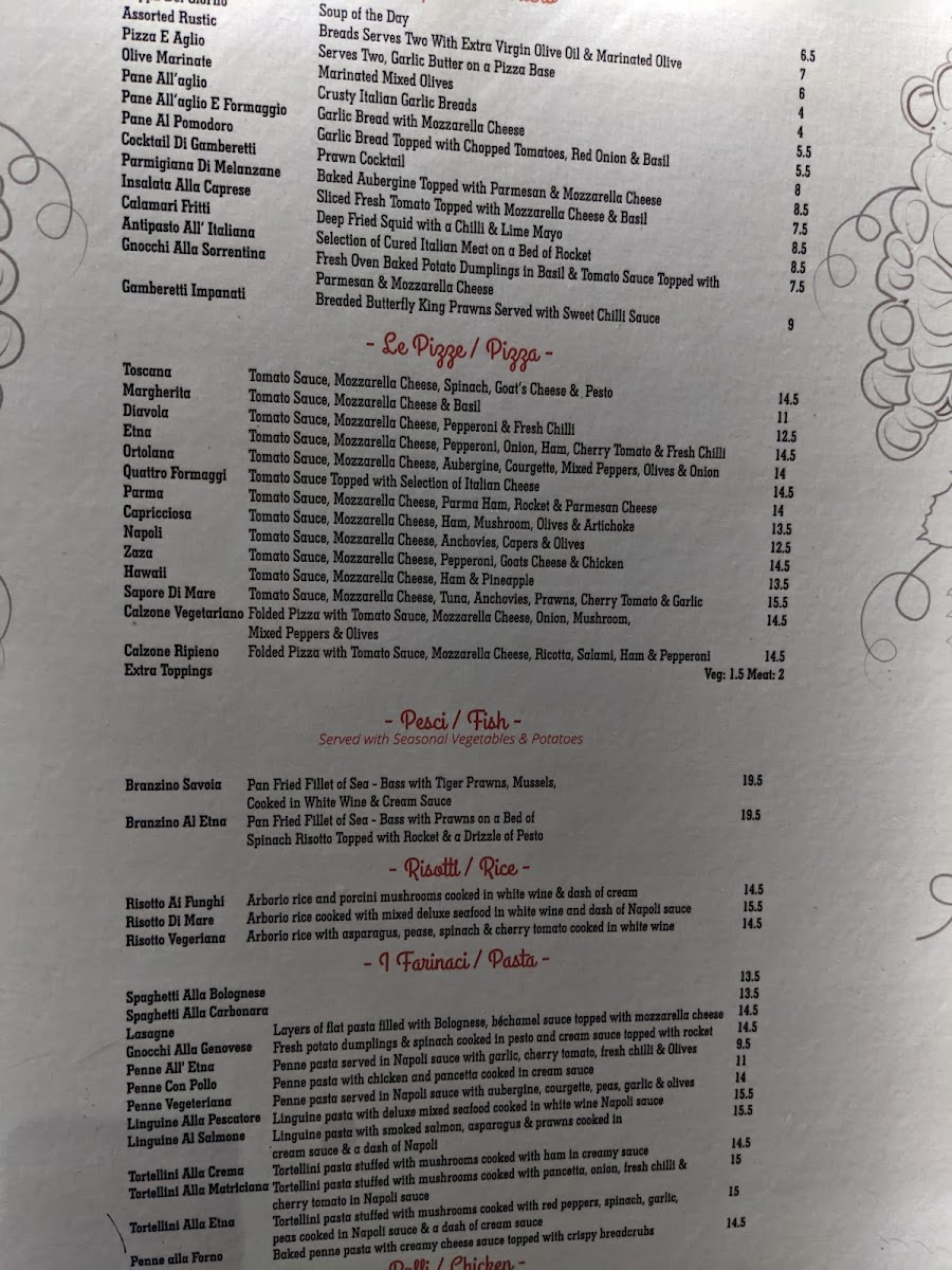 In conclusion, the menu at Etna Italian Restaurant offers a well-rounded selection of classic Italian dishes that cater to a variety of tastes, from comforting starters like Zuppa Del Giorno, Assorted Rustic, and Pane All’aglio E Formaggio to fresh salads such as Insalata Capriciossa and Insalata Cesare. Seafood lovers can enjoy options like Branzino Savoia and Branzino Al Etna, while the risotto selection, including Risotto Di Mare, Risotto Vegeriane, and Risotto Ai Funghi, provides rich and satisfying choices. The chicken dishes, particularly Pollo Ai Funghi, Pollo Alla Dolcelatte, Pollo Alla Etna, and Pollo Marsala, stand out for their hearty flavors, complemented by meat options like Beef Stroganoff and Beef Pizzaiola. Pasta lovers are well served with staples such as Spaghetti Alla Bolognese, Spaghetti Alla Carbonara, Lasagne, Gnocchi Alla Genovese, and Penne All’ Etna. The menu is further enhanced by a thoughtful drinks list featuring wines like La Mandrana Rosso, Merlot, and Montepulciano D’abruzzo, alongside beers such as Peroni and Moretti, and soft drinks including Fanta and San Pellegrino. Overall, while prices are not specified, the variety and traditional offerings make the menu appealing and indicative of a classic Italian dining experience.