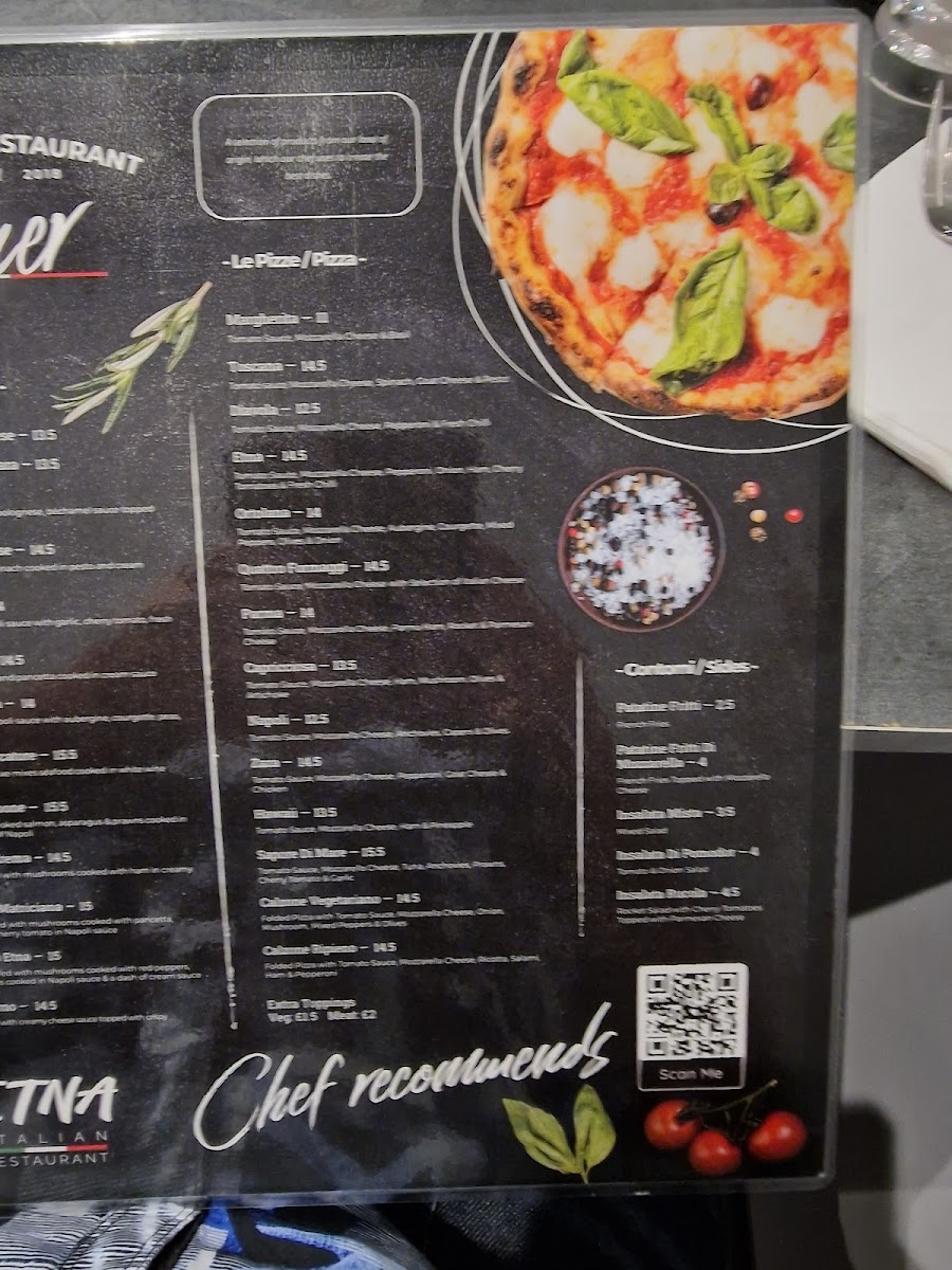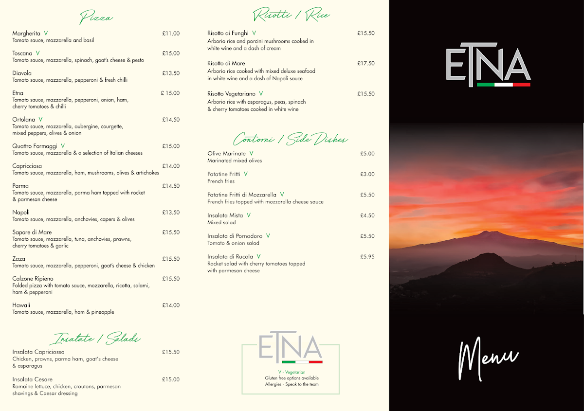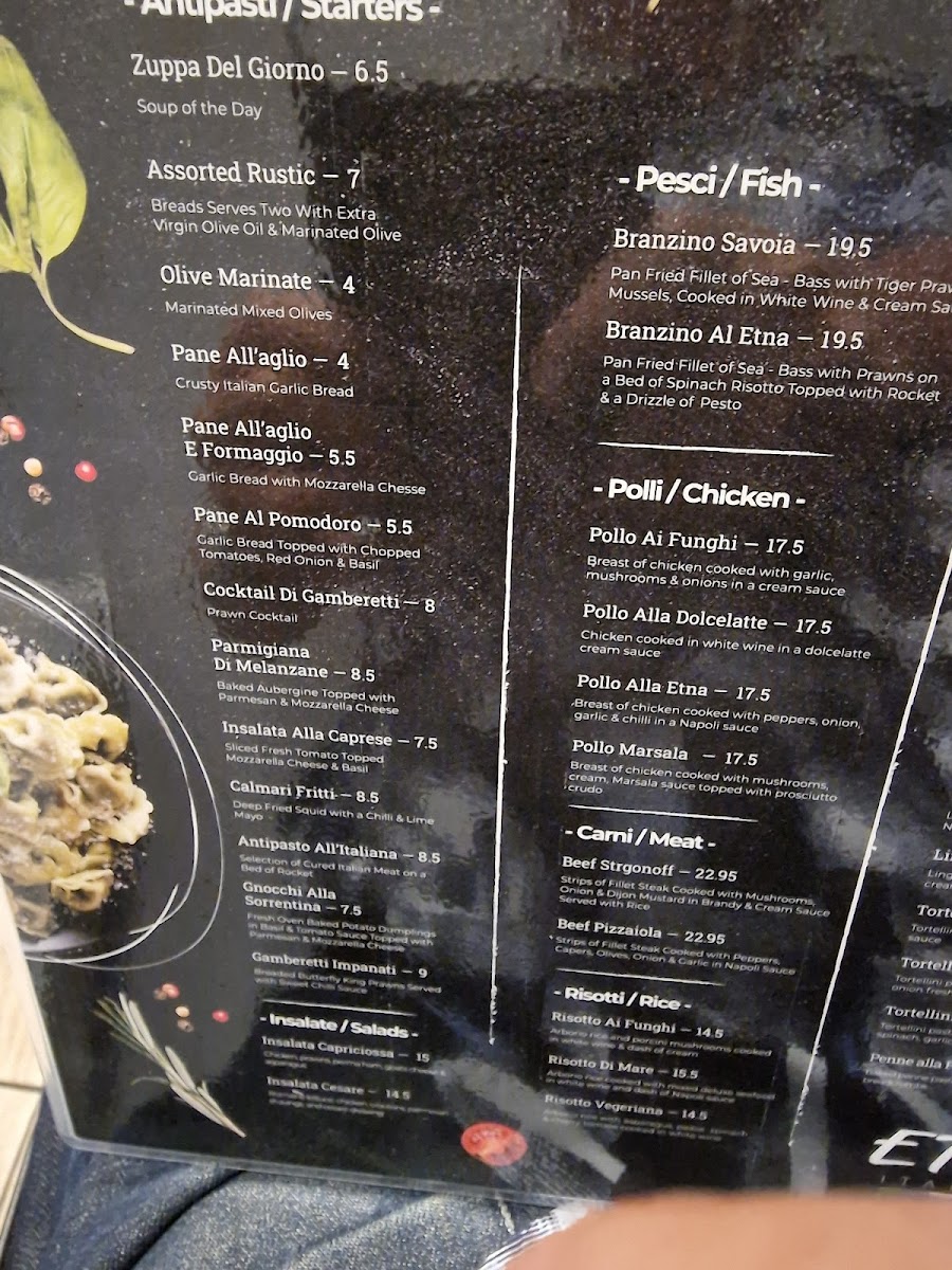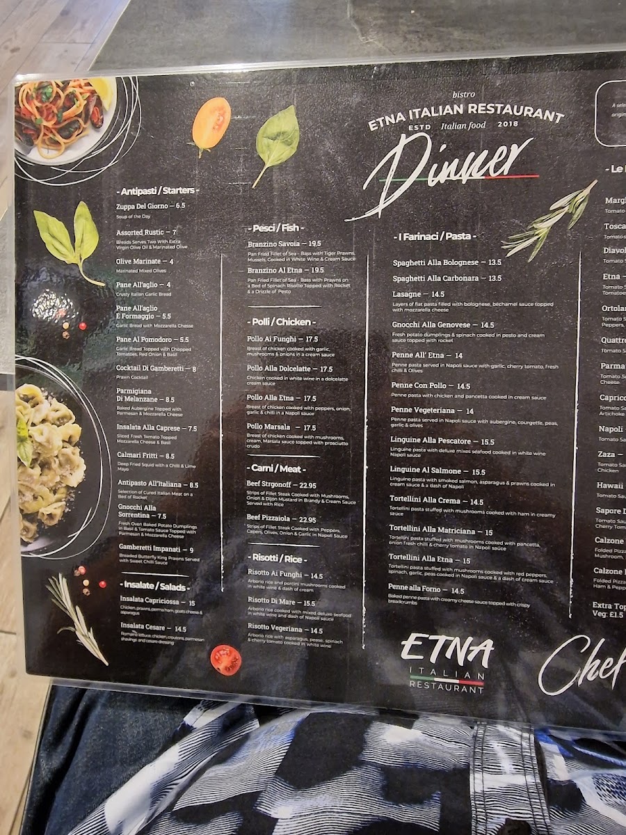 In conclusion, the menu at Etna Italian Restaurant offers a well-rounded selection of classic Italian dishes that cater to a variety of tastes, from comforting starters like Zuppa Del Giorno, Assorted Rustic, and Pane All’aglio E Formaggio to fresh salads such as Insalata Capriciossa and Insalata Cesare. Seafood lovers can enjoy options like Branzino Savoia and Branzino Al Etna, while the risotto selection, including Risotto Di Mare, Risotto Vegeriane, and Risotto Ai Funghi, provides rich and satisfying choices. The chicken dishes, particularly Pollo Ai Funghi, Pollo Alla Dolcelatte, Pollo Alla Etna, and Pollo Marsala, stand out for their hearty flavors, complemented by meat options like Beef Stroganoff and Beef Pizzaiola. Pasta lovers are well served with staples such as Spaghetti Alla Bolognese, Spaghetti Alla Carbonara, Lasagne, Gnocchi Alla Genovese, and Penne All’ Etna. The menu is further enhanced by a thoughtful drinks list featuring wines like La Mandrana Rosso, Merlot, and Montepulciano D’abruzzo, alongside beers such as Peroni and Moretti, and soft drinks including Fanta and San Pellegrino. Overall, while prices are not specified, the variety and traditional offerings make the menu appealing and indicative of a classic Italian dining experience.